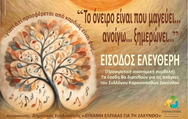 Με πρωτοβουλία του δημοτικού συνδυασμού «Δύναμη Ελπίδας για τη Ζάκυνθο - Γ. Τσουρουνάκης» και με σκοπό την ενίσχυση του Συλλόγου Καρκινοπαθών του νησιού, γνωστοί καλλιτέχνες θα χαρίσουν ανιδιοτελώς νότες ελπίδας στους ανθρώπους που δοκιμάζονται, σε μια συναυλία στο Υπαίθριο Θέατρο Ζακύνθου την Κυριακή 14 Σεπτεμ…