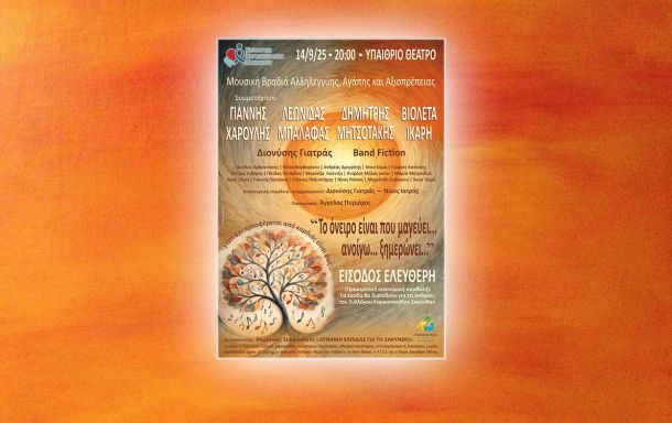 Η Ζάκυνθος ετοιμάζεται να ζήσει μια μοναδική βραδιά μουσικής, αλληλεγγύης, ελπίδας, αγάπης και αξιοπρέπειας. Την Κυριακή 14 Σεπτεμβρίου, στις8:00 το βράδυ, στο Υπαίθριο Θέατρο, κορυφαίοι καλλιτέχνες της ελληνικής μουσικής σκηνής, μαζί με πλήθος τοπικών δημιουργών και συλλόγων, ενώνουν τις φωνές και τις ψυχές τους για έναν ιερό σ…