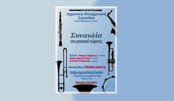 Η συναυλία της ΔΗΜΟΤΙΚΗΣ ΦΙΛΑΡΜΟΝΙΚΗΣ ΖΑΚΥΝΘΟΥ θα πραγματοποιηθεί την Παρασκευή 22 Αυγούστου 2025, και ώρα 21:00, στο Υπαίθριο Δημοτικό Θέατρο Ζακύνθου. Η Είσοδος θα είναι Ελεύθερη για όλους.
