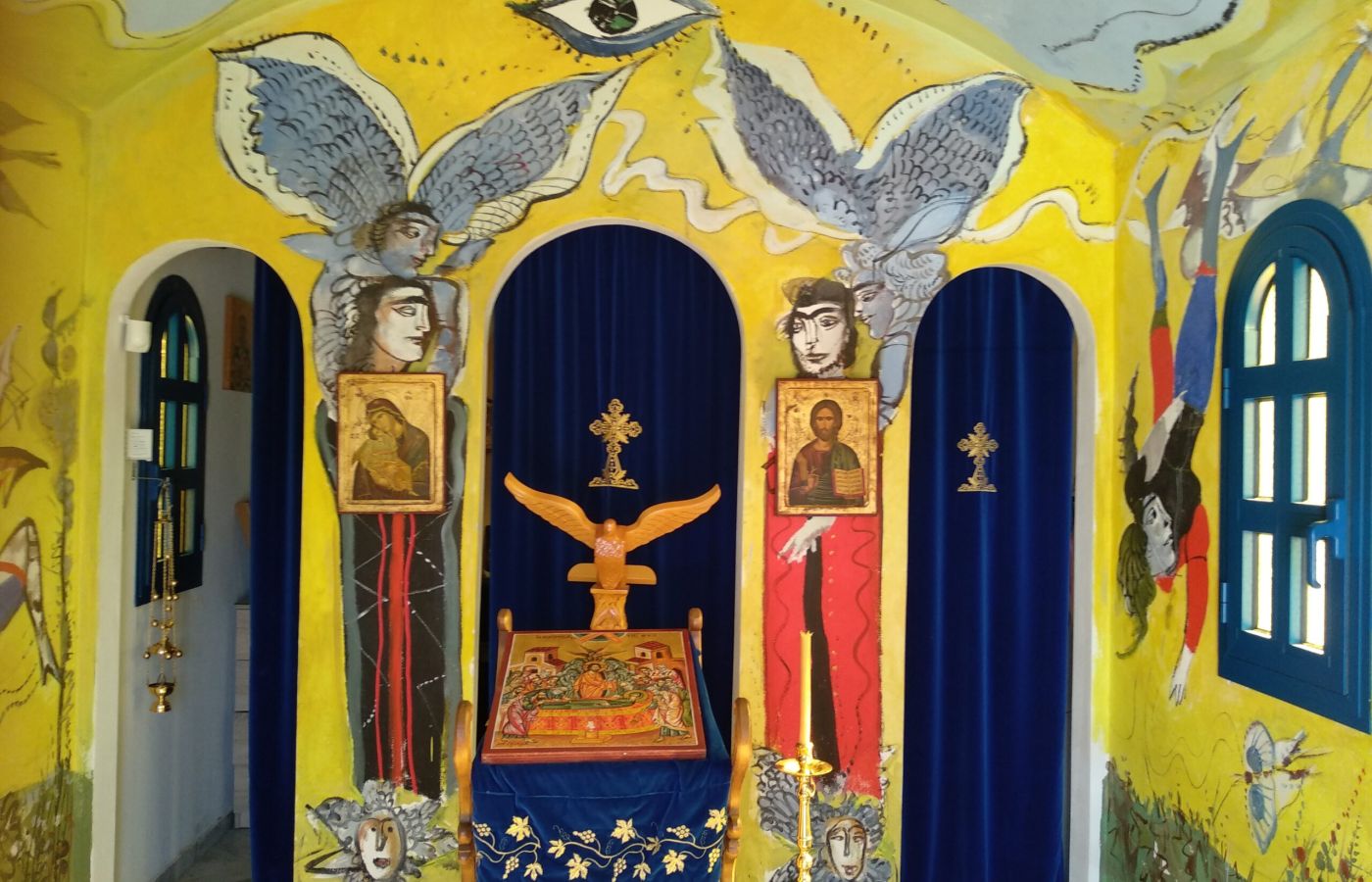Ο Δημήτρης Μυταράς ολοκλήρωσε αυτό που είχε στο μυαλό του μέσα σε 9 μήνες. Το εσωτερικό της εκκλησίας ξεφεύγει από τα συνηθισμένα. Αντί για τις βυζαντινές αγιογραφίες, οι τοίχοι είναι πλημμυρισμένοι από χρώματα.