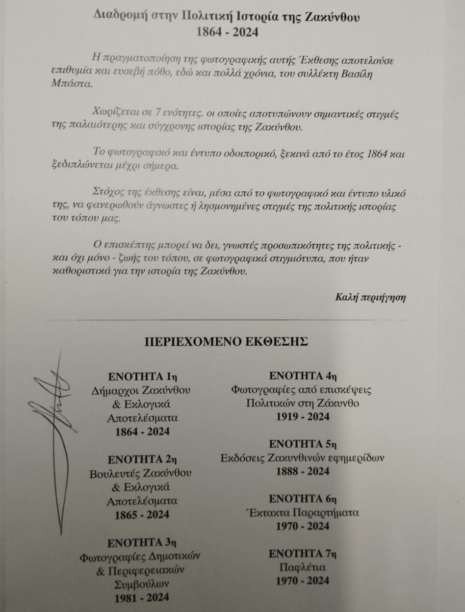 Είναι από το 1864 μέχρι το 2024. Έχουμε μαζέψει 70 κομμάτια ζακυνθινές εφημερίδες, έχουμε όλους τους δημάρχους από τον πρώτο μέχρι και τον σημερινό και όλα τα εκλογικά αποτελέσματα. Έχουμε επίσης όλους τους βουλευτές που έχουν περάσει. Οι ενότητες είναι 7. Έχουμε πολύ υλικό, όποιος έχει πολιτευτεί και έχει βγάλει φωτογραφία θα είναι στην έκθεση.
