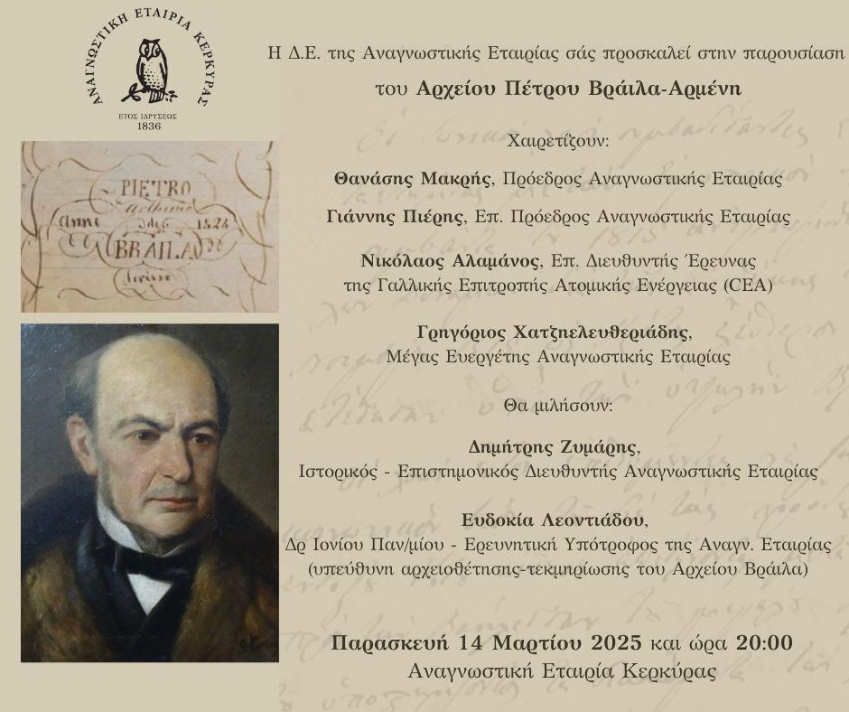 Η Δ.Ε. της Αναγνωστικής Εταιρίας Κερκύρας, σας προσκαλεί στην παρουσίαση του Αρχείου Πέτρου Βράιλα-Αρμένη,που θα πραγματοποιηθεί την Παρασκευή 14 Μαρτίου, στις 20:00, στην Αναγνωστική Εταιρία Κερκύρας.