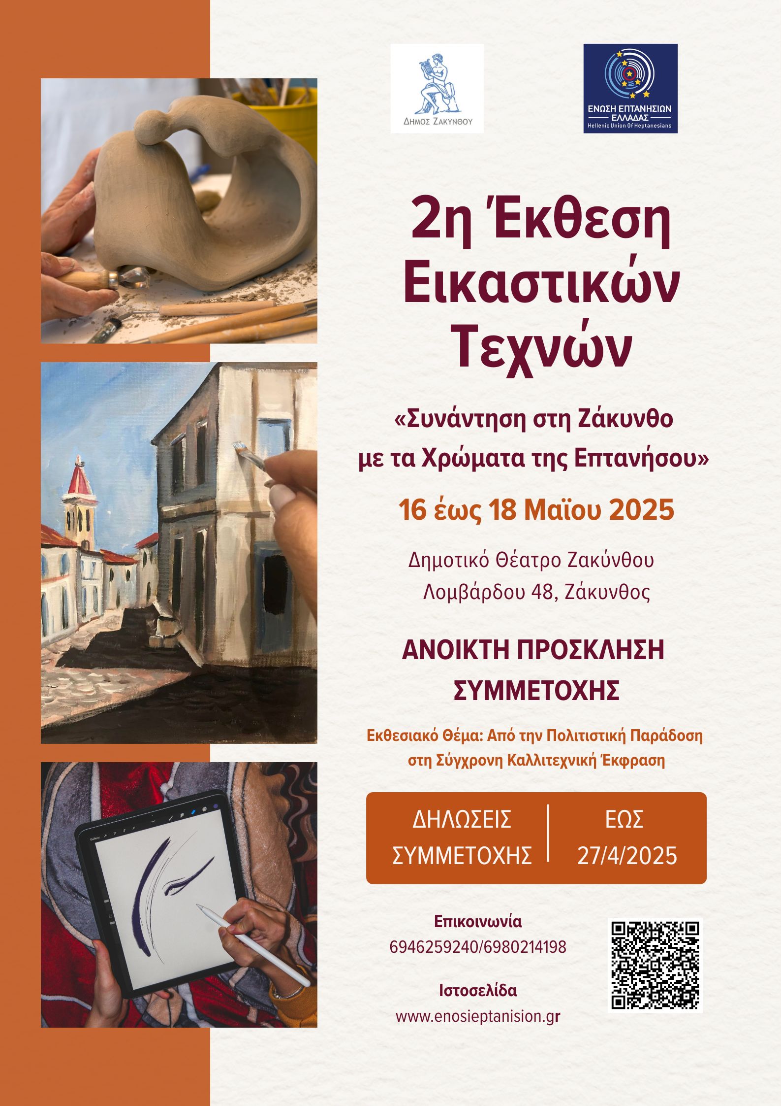 Με ιδιαίτερη χαρά σας ενημερώνουμε για την επικείμενη έκθεση εικαστικών τεχνών ”Συνάντηση στη Ζάκυνθο με τα χρώματα της Επτανήσου” η οποία θα πραγματοποιηθεί από τις 16 έως και τις 18 Μαϊου 2025 στο Δημοτικό Θέατρο της Ζακύνθου (φουαγιέ).