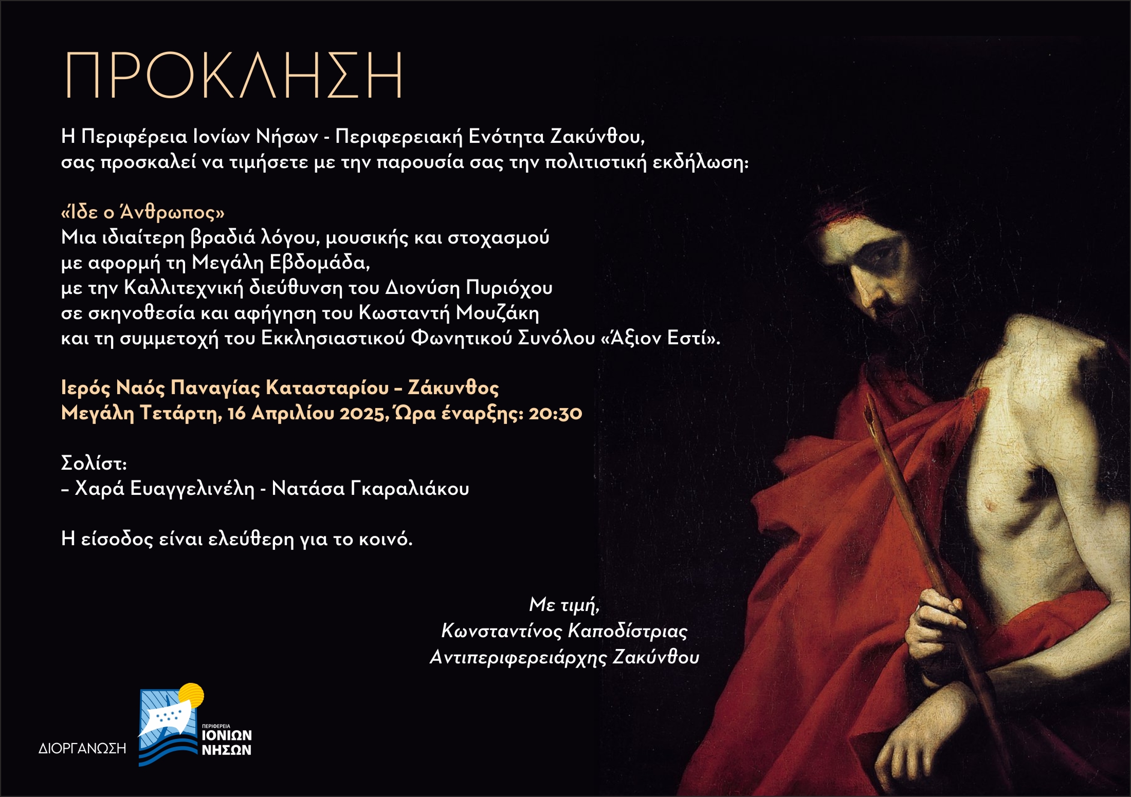 Η Περιφέρεια Ιονίων Νήσων – Περιφερειακή Ενότητα Ζακύνθου, με αίσθημα σεβασμού προς την πνευματικότητα της Μεγάλης Εβδομάδας, παρουσιάζει την πολιτιστική εκδήλωση με τίτλο «Ίδε ο Άνθρωπος», τη Μεγάλη Τετάρτη, 16 Απριλίου 2025 και ώρα 20:30, στον Ιερό Ναό Παναγίας Κατασταρίου στη Ζάκυνθο.