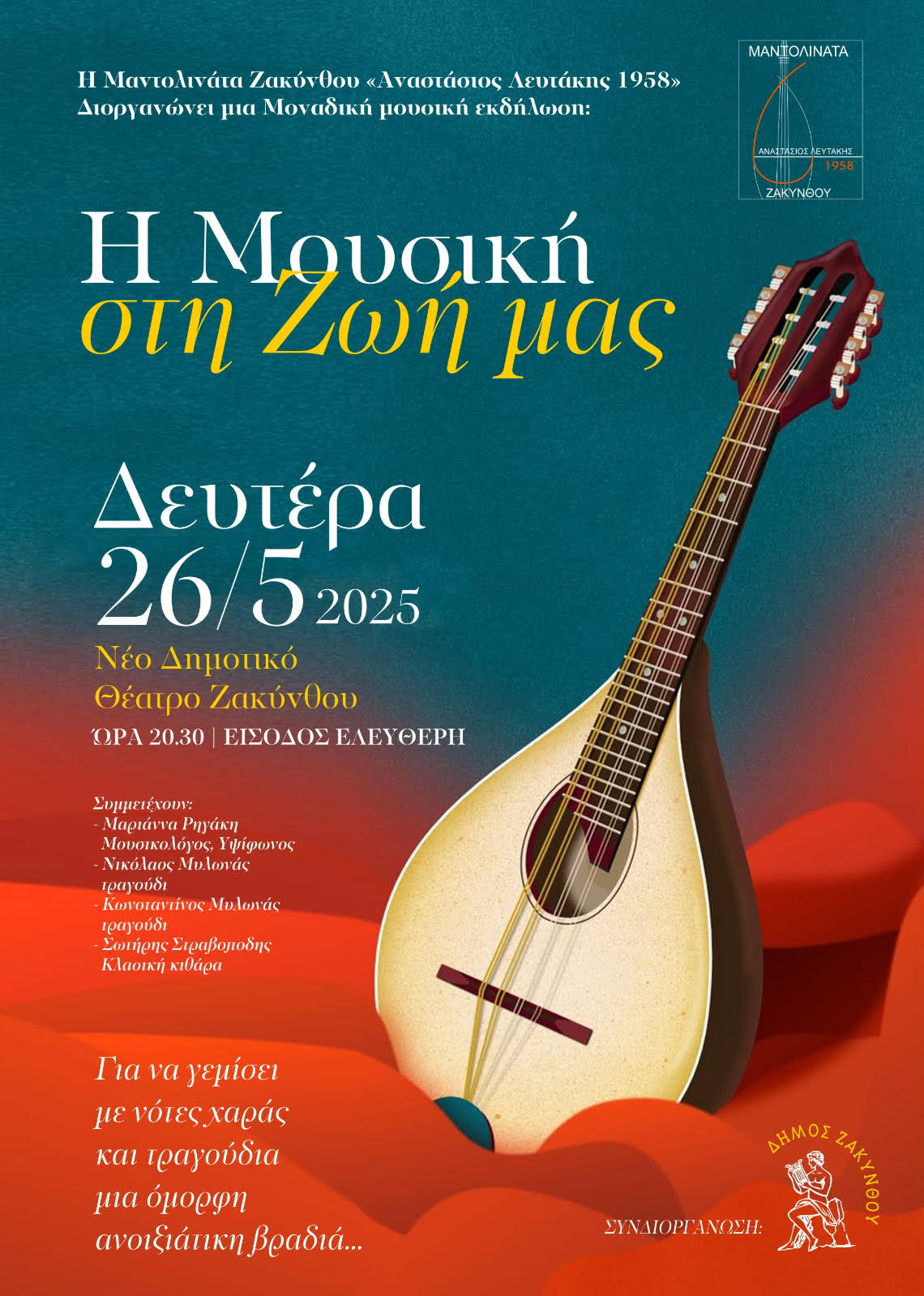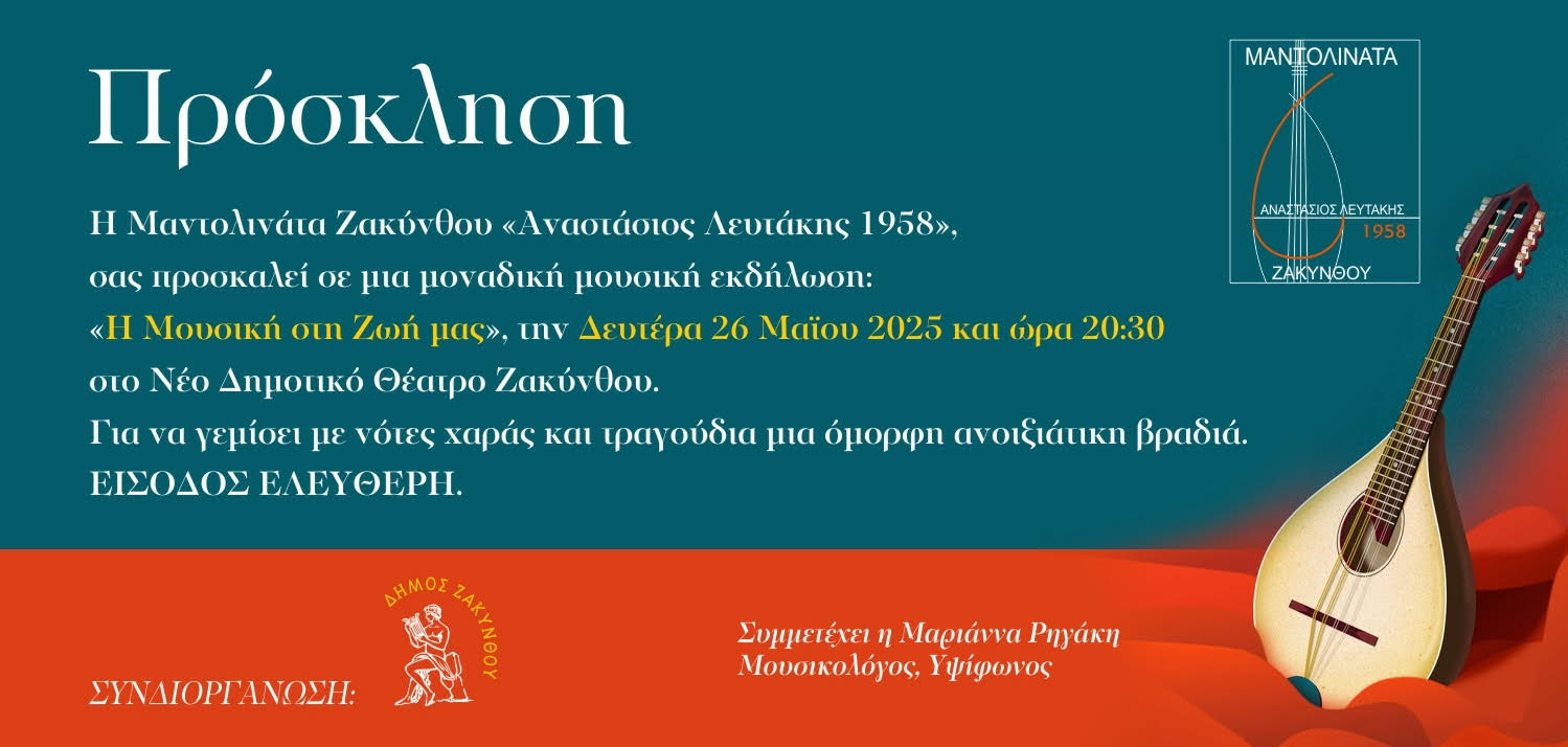 Η Μαντολινάτα Ζακύνθου Αναστάσιος Λευτάκης 1958 θα παρουσιάσει την εκδήλωση με τίτλο «Η Μουσική στη ζωή μας».