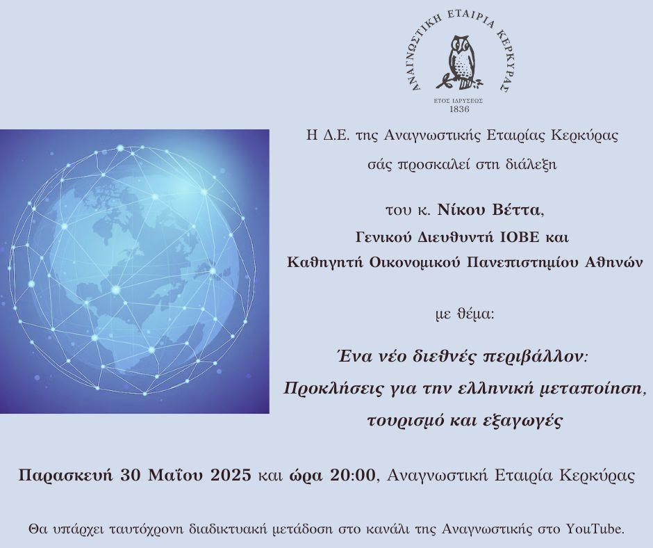 Η Δ.Ε. της Αναγνωστικής Εταιρίας Κερκύρας σάς προσκαλεί στη διάλεξη του Γενικού Διευθυντή ΙΟΒΕ και Καθηγητή Οικονομικού Πανεπιστημίου Αθηνών κ. Νίκου Βέττα