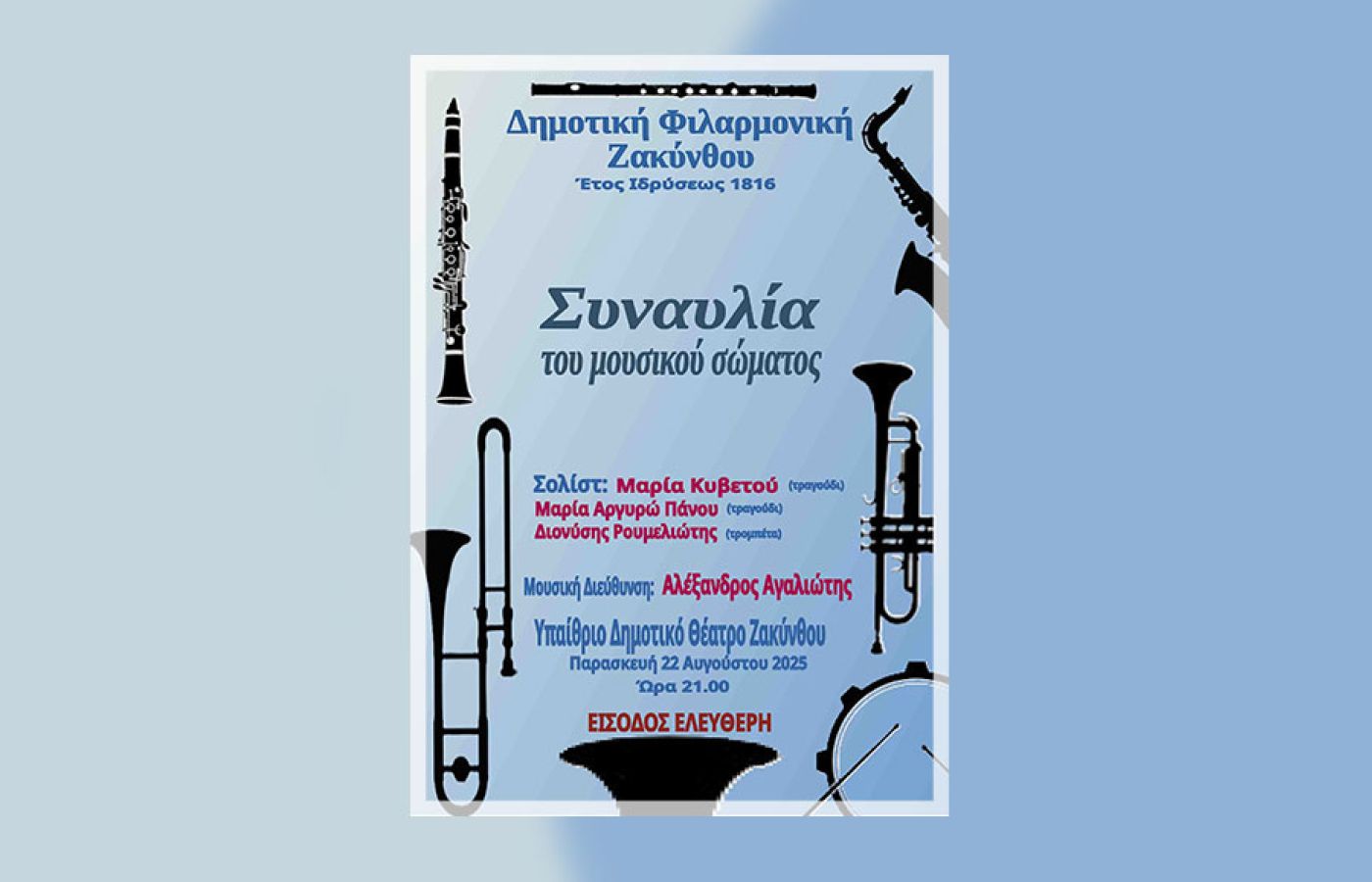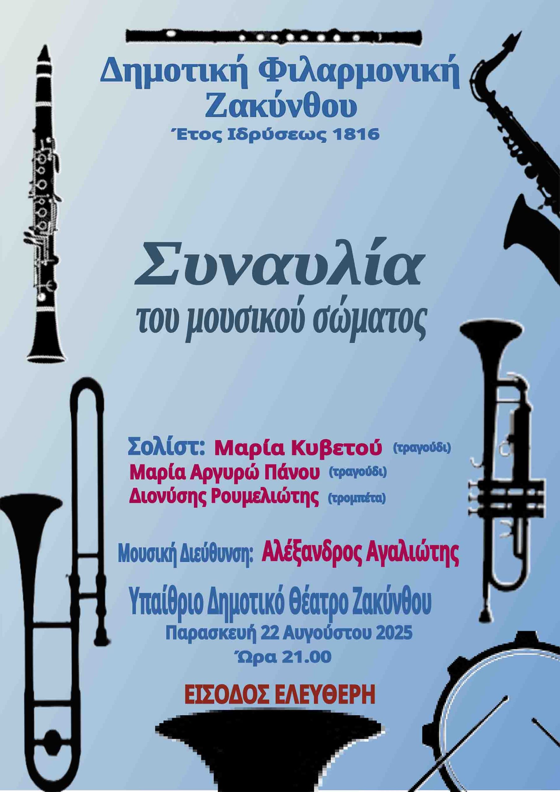 Η συναυλία της ΔΗΜΟΤΙΚΗΣ ΦΙΛΑΡΜΟΝΙΚΗΣ ΖΑΚΥΝΘΟΥ θα πραγματοποιηθεί την Παρασκευή 22 Αυγούστου 2025, και ώρα 21:00, στο Υπαίθριο Δημοτικό Θέατρο Ζακύνθου. Η Είσοδος θα είναι Ελεύθερη για όλους.