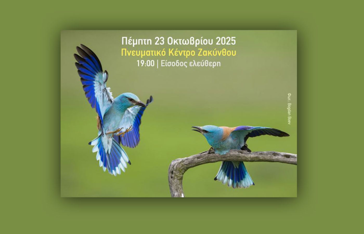 Η Ελληνική ΟΡΝΙΘΟΛΟΓΙΚΗ Εταιρεία σας προσκαλεί σε εκδήλωση αφιερωμένη στα μεταναστευτικά πουλιά και τη φύση της Ζακύνθου, την Πέμπτη, 23 Οκτωβρίου 2025 και ώρες 19:00 - 21:00, στο Πνευματικό Κέντρο Δήμου Ζακύνθου.