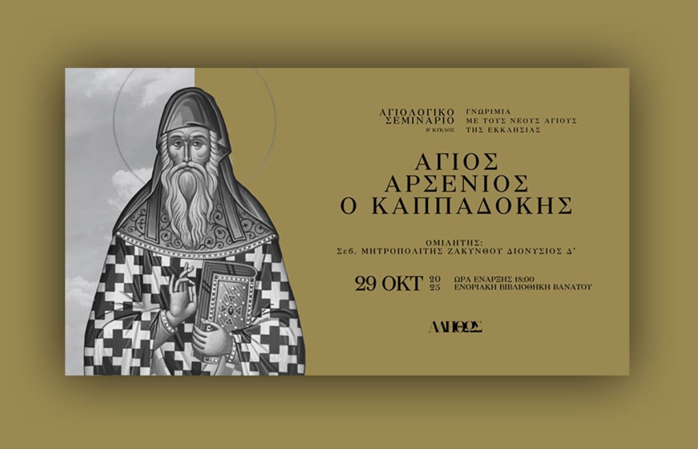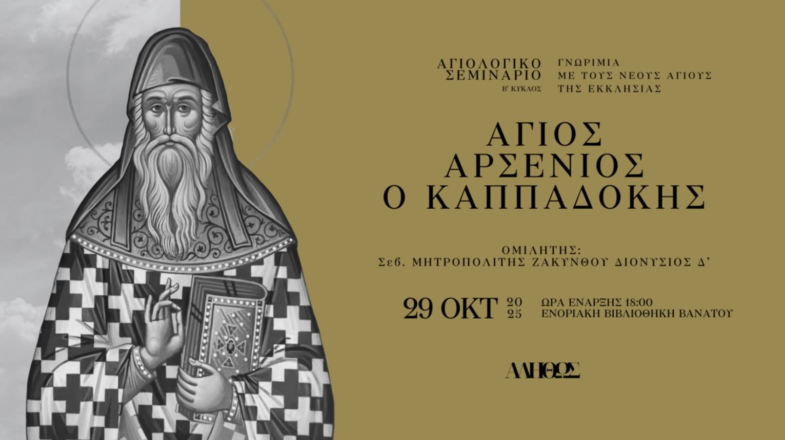 Ευρισκόμενοι στον β΄ κύκλο του Σεμιναρίου Αγιολογίας, που λειτουργεί στο «Αληθώς» - Μορφωτικό Κέντρο Λόγου και Τέχνης Ενορίας Βανάτου, με γενικό θέμα: «Γνωριμία με τους νεοδιακηρυχθέντες Αγίους της Ορθόδοξης Εκκλησίας», την ερχόμενη Τετάρτη, 29 Οκτωβρίου 2025, ώρα 6 μ.μ., ο υπεύθυνος στης σειράς, Σεβ. Μητροπολίτης Ζακύνθου κ. Διονύσιος Δ΄, θα παρουσιάσει τον βίο και την πολιτεία του Αγίου Αρσενίου του Καππαδόκη.