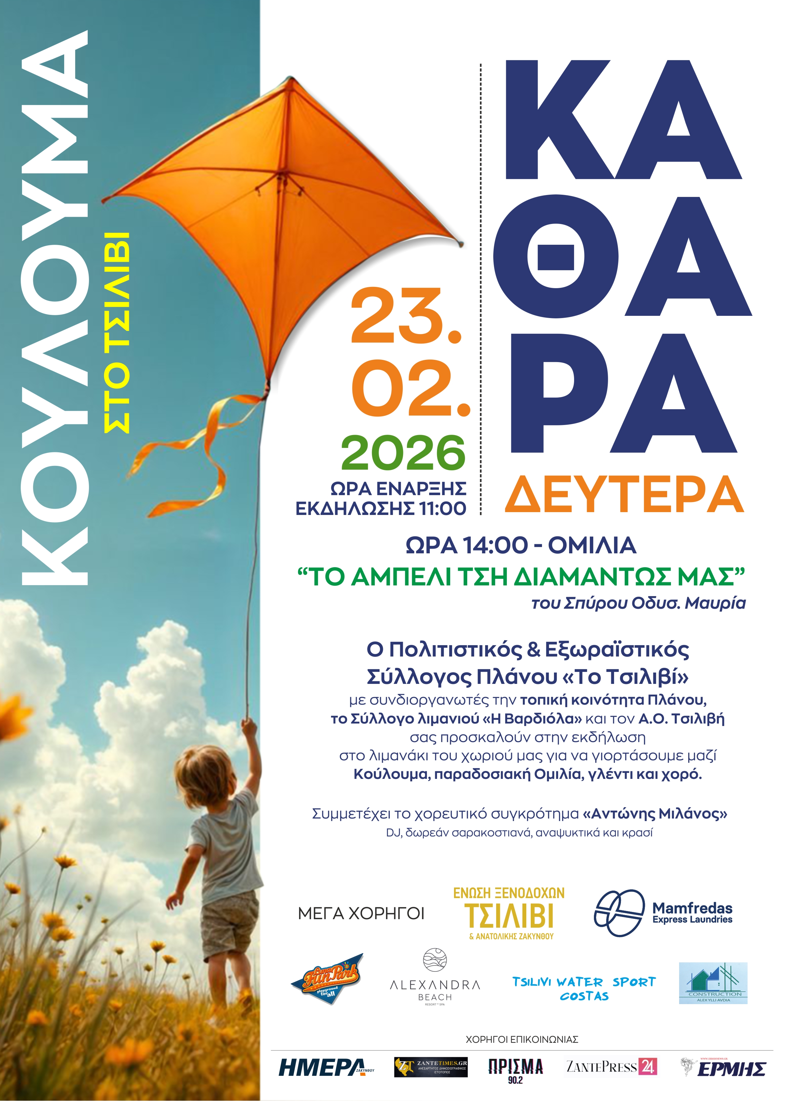 Ο πολιτιστικός & εξωραϊστικός σύλλογος Πλάνου "ΤΟ ΤΣΙΛΙΒΙ" σε συνεργασία με την τοπική Κοινότητα Πλάνου, τον σύλλογο λιμανιού "Η ΒΑΡΔΙΟΛΑ " και τον «ΑΟ ΤΣΙΛΙΒΙ» μας καλωσορίζουν στο λιμανάκι του Τσιλιβί την καθαρά Δευτέρα 23/02/2026 από τις 12:00 το μεσημέρι μέχρι αργά το βράδυ, για να γιορτάσουμε τα Κούλουμα.