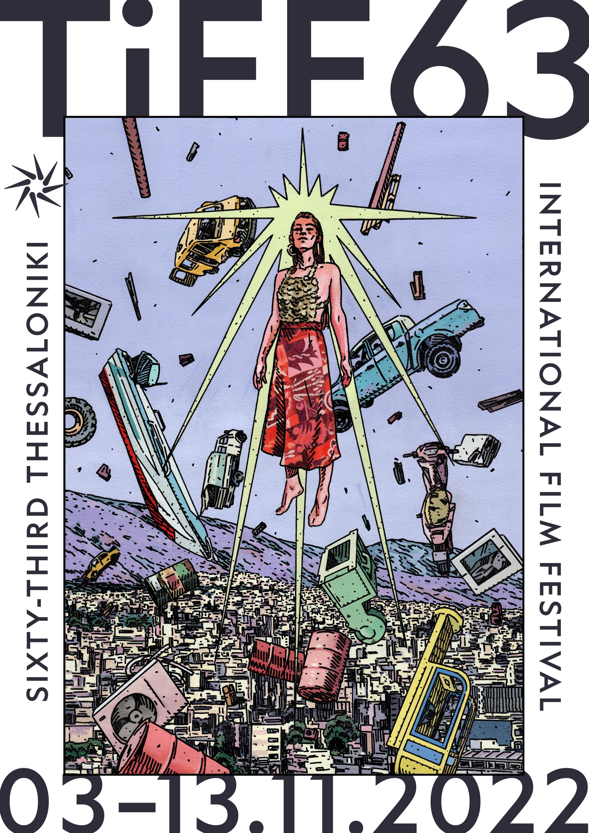 Μια γυναικεία φιγούρα, ξυπόλητη και ντυμένη σε κόκκινες και χρυσές αποχρώσεις, αιωρείται πάνω από την πόλη. Πηγή της ζωής και πυρήνας του κόσμου, μαγνητίζει και έλκει όλα όσα μας περιβάλλουν και μας ορίζουν. Επαναδιαπραγματεύεται την αναπαράσταση της γυναίκας. Αυτό απεικονίζει η αφίσα του 63ου Φεστιβάλ Κινηματογράφου Θεσσαλονίκης που δημιούργησε ο εικαστικός και visual artist Δημήτρης Τριμίτζιος (Taxis). Πρόκειται για την υπερηρωίδα της πραγματικής ζωής η οποία ξεπερνά και υπερβαίνει τους αμέτρητους ρόλους που της έχουν ανατεθεί. Που απαιτεί από τον καθένα μας και όλους μαζί να δούμε μέσα από ένα καινούργιο βλέμμα.