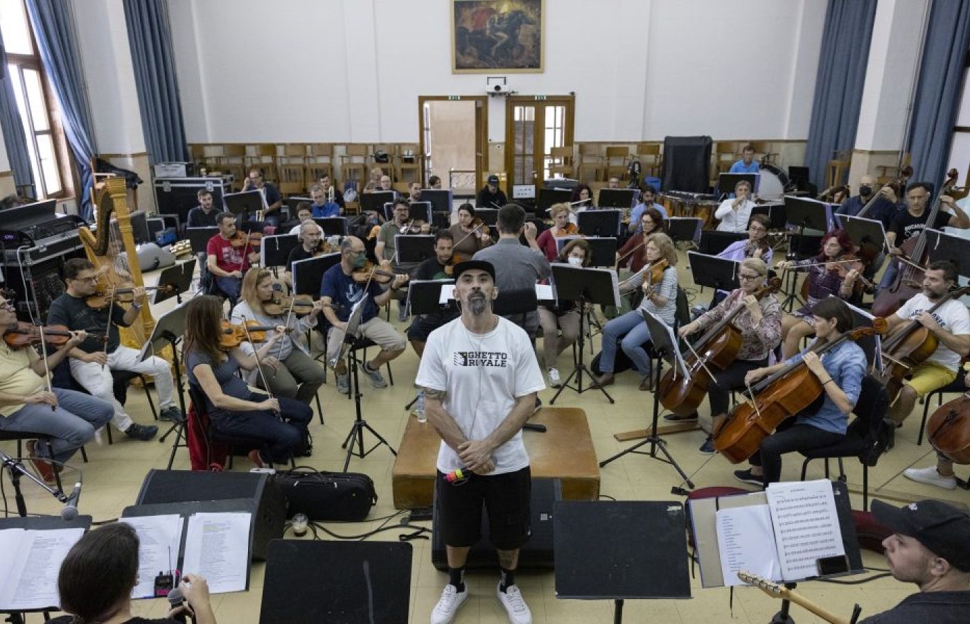 Photo:Ο ράπερ 12ος Πίθηκος (Ακης Τσινίδης) περιστοιχισμένος από τους μουσικούς της ΣΟΔΘ στις τελευταίες πρόβες πριν από τη συναυλία του Σαββάτου. [ΑΛΕΞΑΝΔΡΟΣ ΑΒΡΑΜΙΔΗΣ]