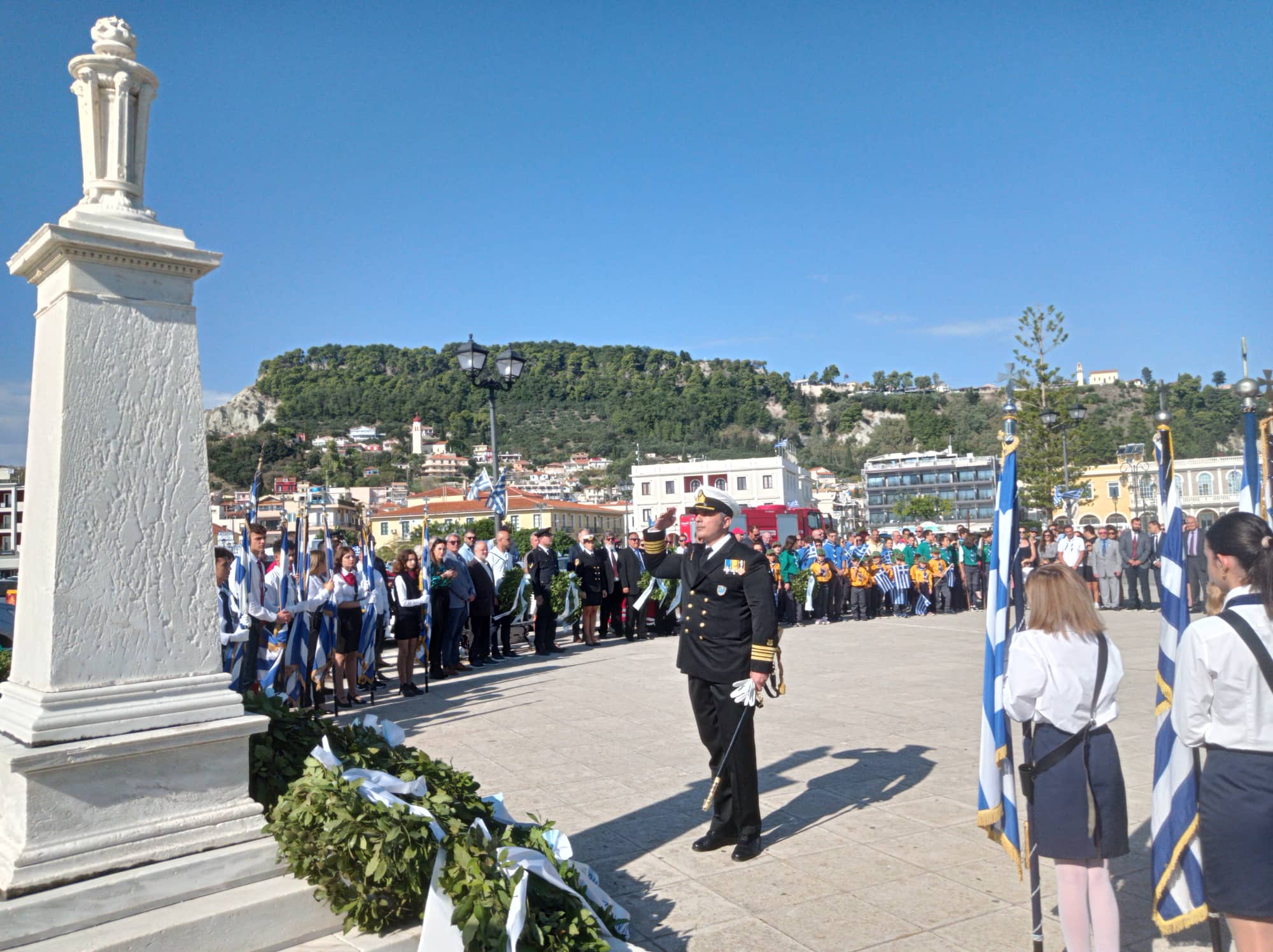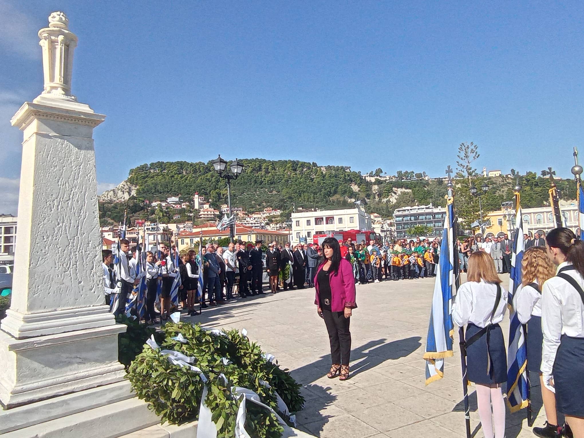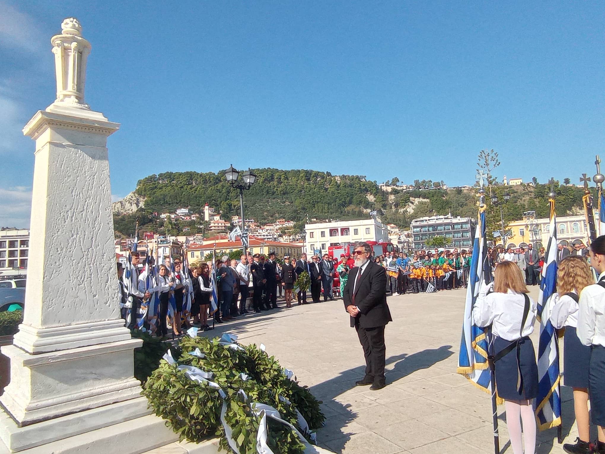 Η παρέλαση των σχολείων της Α΄βάθμιας και Β΄βάθμιας εκπαίδευσης και των σωμάτων Ελληνικού Οδηγισμού και Ελλήνων Προσκόπων μπροστά από το Μέγαρο της Π.Ε. Ζακύνθου