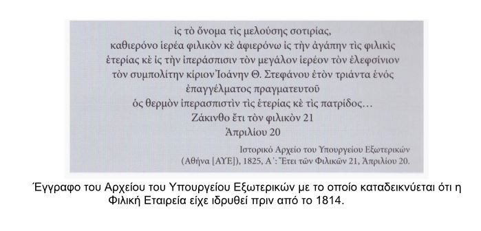 Εδώ επιβάλλεται μία διευκρίνιση. Η Φιλική Εταιρεία είχε ιδρυθεί πολύ πριν από το 1814. Ο αρχικός της, πράγματι πυρήνας είχε διαμορφωθεί κατά τη δεκαετία του 1780 στο Βουκουρέστι της Βλαχίας. Το 1786, ηγεμόνας έγινε εκεί ο συγγενής των περίφημων Morosini της Βενετίας Νικόλαος Μαυρογένης. Ο Ρήγας είχε αναλάβει καθήκοντα ιδιαίτερου γραμματέα αυτού του τελευταίου. Όταν όμως ο Μαυρογένης θεωρήθηκε ύποπτος για συνεργασία με τους Ρώσους και με απόφαση της Υψηλής Πύλης (= οθωμανικής κυβέρνησης) θανατώθηκε, ο Ρήγας έφυγε στη Βιέννη όπου μετέφερε, αναλαμβάνοντας την ηγεσία, την έδρα της ελληνικής συνωμοτικής οργάνωσης. Ήδη όμως η «καρδιά» της Εταιρείας χτυπούσε στη Ρωσία. Και αυτό, επειδή άλλος Έλληνας, της οικογένειας των Μαυροκορδάτων αυτός, ηγεμόνας της Μολδαβίας, όταν κατάλαβε ότι η ζωή του κινδύνευε από τους Τούρκους, κατέφυγε στη ρωσική επικράτεια όπου γνωστός με το παρωνύμιο «Φιραρής» (= Φυγάδας) ίδρυσε επισήμως τη Φιλική Εταιρεία.