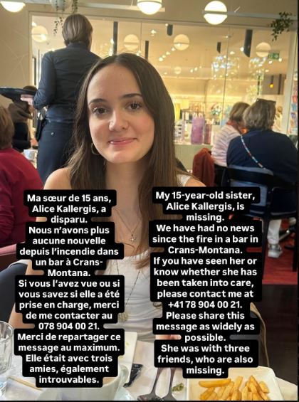 Η 15χρονη Αλίκη Καλλέργη, που φέρεται να συγκαταλέγεται μεταξύ των δεκάδων αγνοουμένων από την τραγωδία στο Κραν Μοντανά, διαθέτει διπλή υπηκοότητα, ελληνική και ελβετική, και ζει μόνιμα στην Ελβετία.