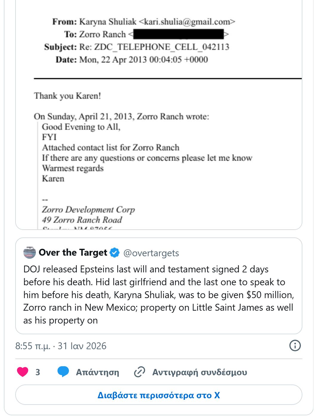 Ο Έπσταϊν σχεδίαζε να αφήσει στη σύντροφό του Καρίνα Σουλιάκ 50 εκατομμύρια δολάρια, ένα διαμαντένιο δαχτυλίδι 33 καρατίων, το περίφημο «νησί των παιδεραστών» Little Saint James και το σπίτι του στη Νέα Υόρκη.