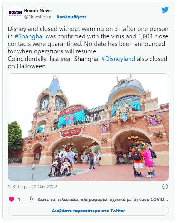 Το θεματικό πάρκο Disney Resort στη Σανγκάη ανέστειλε ξαφνικά τη λειτουργία του σήμερα για να συμμορφωθεί με τα μέτρα πρόληψης της COVID-19, με όλους τους επισκέπτες που βρίσκονταν στον χώρο τη στιγμή της ανακοίνωσης να καλούνται να παραμείνουν στο πάρκο έως ότου υποβληθούν σε διαγνωστικό τεστ για τον ιό και έχουν αρνητικό αποτέλεσμα.