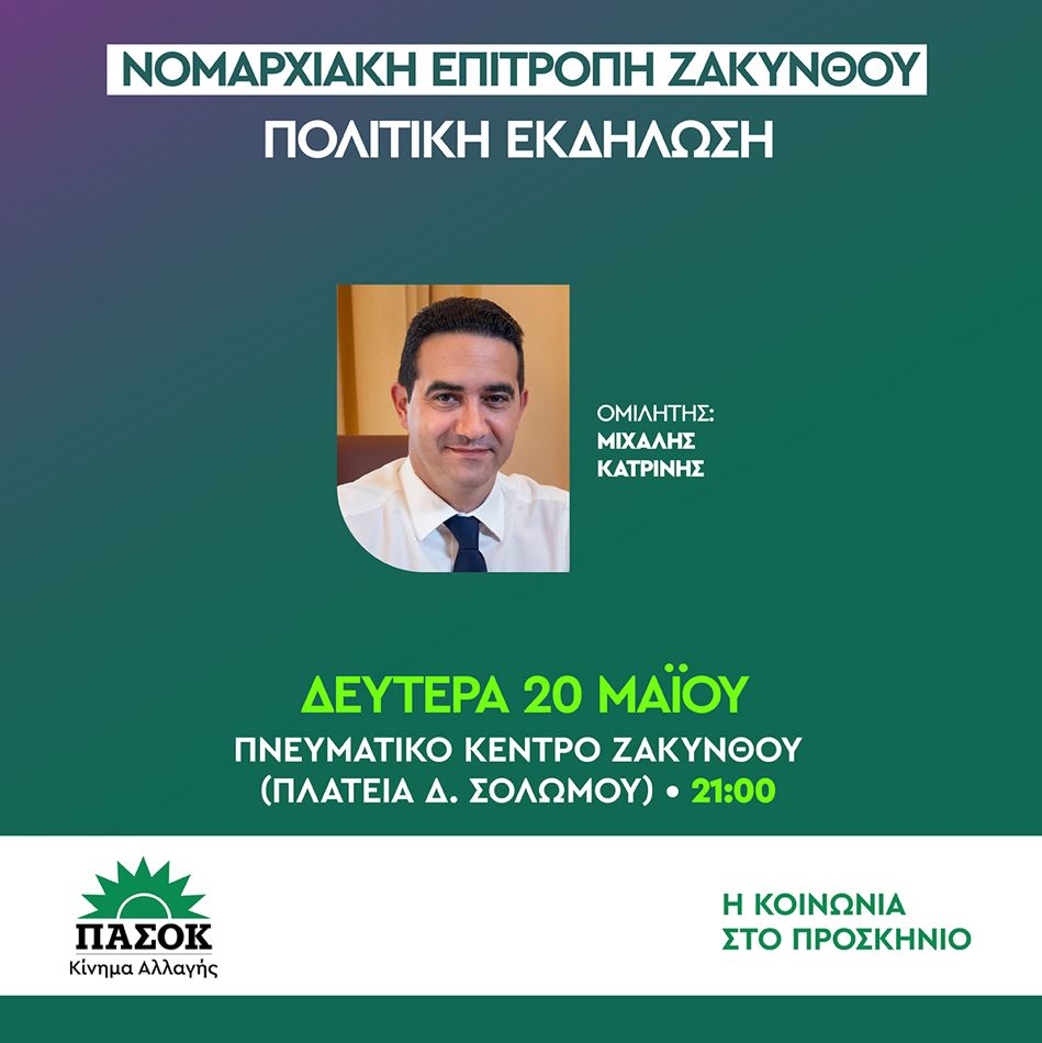 Την ερχόμενη Δευτέρα και Τρίτη 20 και 21 /05/ 2024, θα έχουμε την τιμή να υποδεχτούμε στο νησί μας τον βουλευτή Ηλείας του ΠΑΣΟΚ και κοινοβουλευτικό εκπρόσωπο του κόμματος μας σ. Μιχάλη Κατρίνη, ο οποίος τη Δευτέρα 20/5 και ώρα 21:00 θα μιλησει σε ανοιχτή συγκέντρωση στο Πνευματικό Κέντρο Ζακύνθου και την Τρίτη θα εκπροσωπήσει το ΠΑΣΟΚ στις εορταστικές εκδηλώσεις για την ένωση των Επτανήσων με την Ελλάδα!