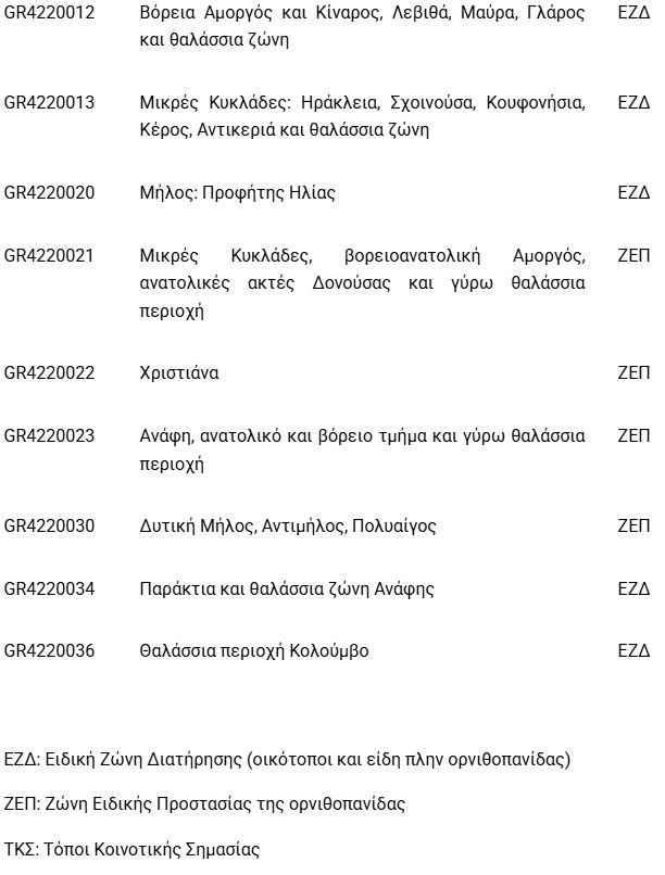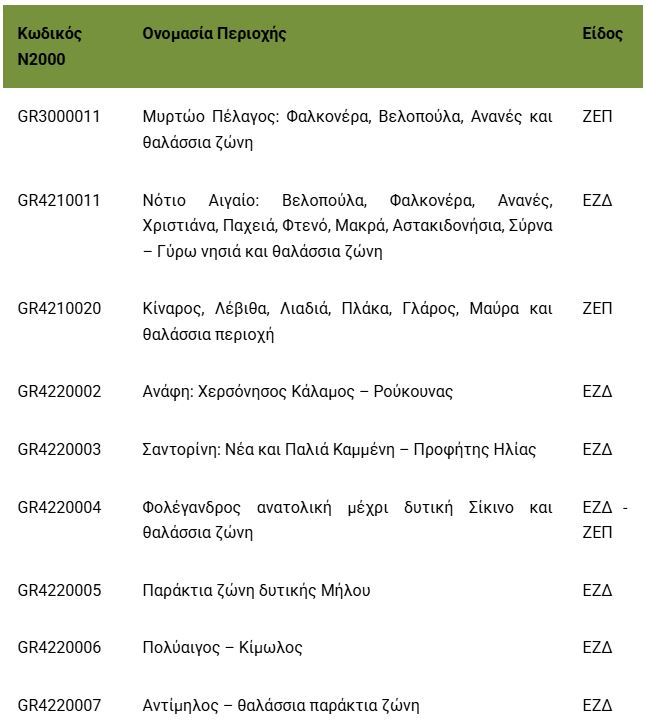 Περιοχές του Δικτύου Natura 2000 (ή τμήματά τους) που περιλαμβάνονται στο Εθνικό Θαλάσσιο Πάρκο Νοτίου Αιγαίου 1 – Νότιες Κυκλάδες