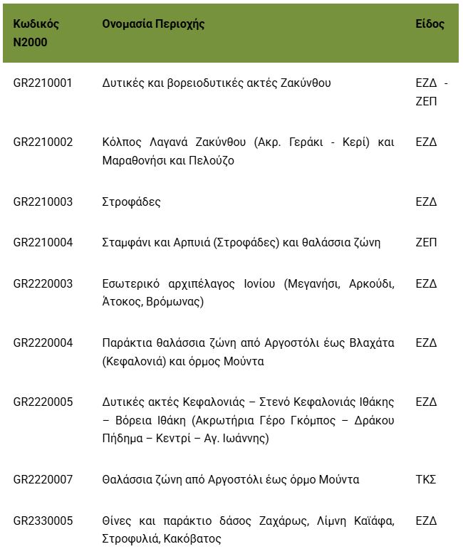Περιοχές του Δικτύου Natura 2000 (ή τμήματά τους) που περιλαμβάνονται στο Εθνικό Θαλάσσιο Πάρκο Ιονίου