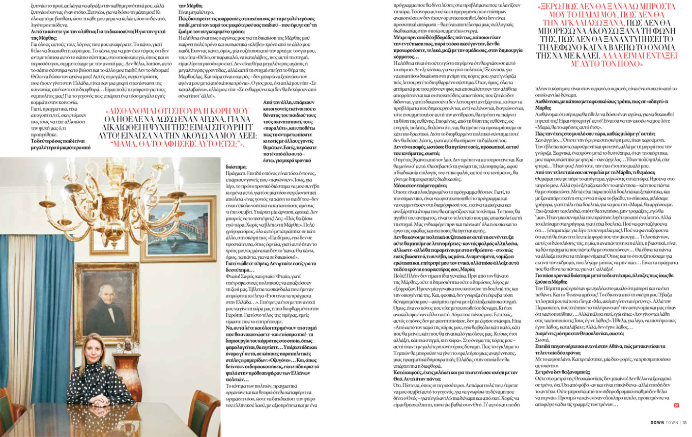 Η αλήθεια είναι πως ο αγώνας μου για τη δικαίωση της Μάρθης μού παίρνει πολύ χρόνο και ουσιαστικά «κλέβει» χρόνο από το άλλο μου παιδί. Έχοντας κάνει, όμως, μία συζήτηση από την αρχή με τον γιο μου, του είπα «Θέλω, σε παρακαλώ, να καταλάβεις, πως αυτή τη στιγμή, είμαι λίγο περισσότερο εκεί. Δεν είναι θέμα μεγαλύτερης αγάπης ή μεγαλύτερης φροντίδας, αλλά αυτή τη στιγμή επείγει το θέμα της Μαρθούλας. Και τώρα είναι ο καιρός – δεν μπορώ να ξεκινήσω τον αγώνα μου μετά από κάποια χρόνια». Ο γιος μου, όχι απλά μου είπε «Σε καταλαβαίνω», αλλά μου είπε «Σε ενθαρρύνω και δεν θα δεχόμουν από σένα τίποτ’ άλλο!».