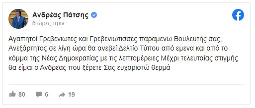 «Οι εξηγήσεις του βουλευτή Ανδρέα Πάτση για επαγγελματικές του δραστηριότητες, που δεν συνάδουν με την ιδιότητα του βουλευτή και τις αρχές της Νέας Δημοκρατίας, δεν κρίθηκαν επαρκείς. Κατόπιν τούτου, με απόφαση του Πρωθυπουργού Κυριάκου Μητσοτάκη ο βουλευτής Γρεβενών Ανδρέας Πάτσης, τίθεται εκτός Κοινοβουλευτικής Ομάδας της ΝΔ» ανέφερε ανακοίνωση του Μαξίμου.