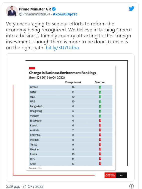 «Είναι πολύ ενθαρρυντικό να αναγνωρίζονται οι προσπάθειές μας για τη μεταρρύθμιση της οικονομίας. Πιστεύουμε στη μετατροπή της Ελλάδας σε μια φιλική προς τις επιχειρήσεις χώρα που προσελκύει περαιτέρω ξένες επενδύσεις. Αν και πρέπει να γίνουν περισσότερα, η Ελλάδα βρίσκεται στο σωστό δρόμο» έγραψε στο twitter ο Κυριάκος Μητσοτάκης.
