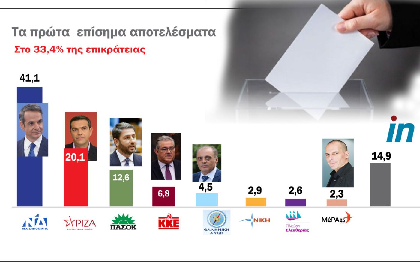 Εκτός βέβαια κι αν τις επόμενες ημέρες υπάρξουν συνεννοήσεις και συνεργασίες που μπορούν να αποτρέψουν τις δεύτερες εκλογές, αν και με τόσο μεγάλο ποσοστό ο κ. Μητσοτάκης ενδεχομένως να θελήσει «καθαρή λύση» σε νέες κάλπες.