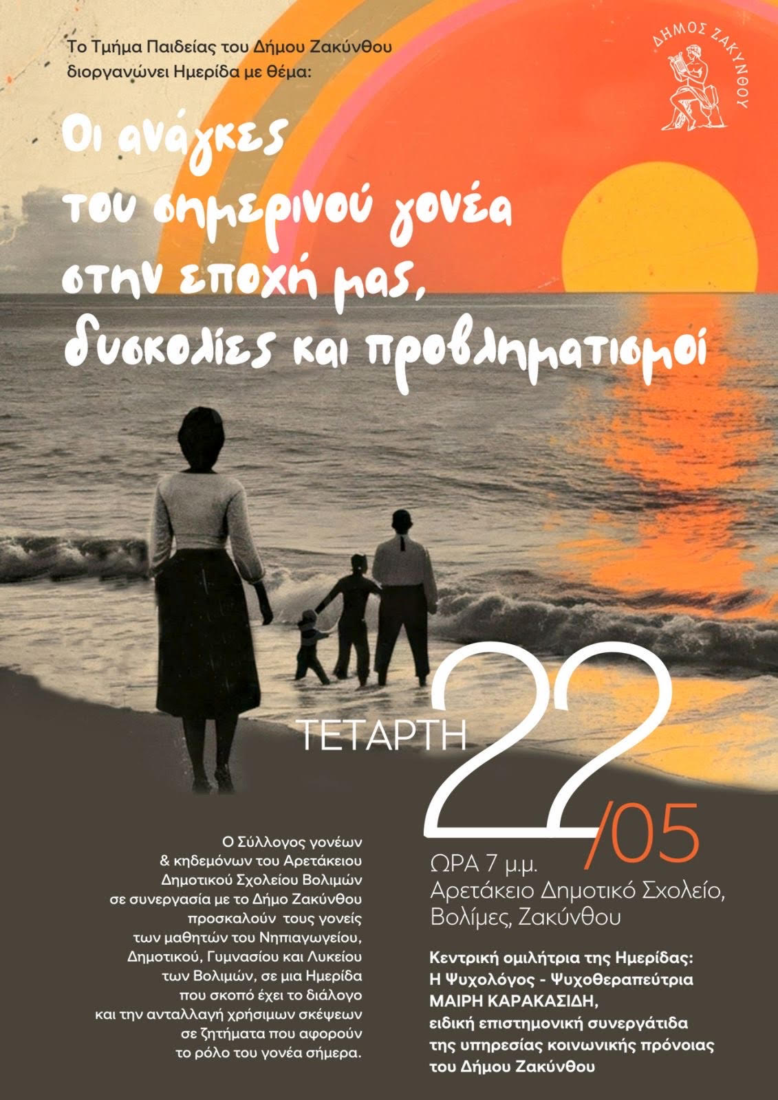Με πρωτοβουλία του Τμήματος Παιδείας του Δήμου Ζακύνθου διοργανώνεται την Τετάρτη 22/05 και ώρα 7 μ.μ. στο Αρετάκειο Δημοτικό Σχολείο Βολιμών νέα Ημερίδα με θέμα : «Οι ανάγκες του σημερινού γονέα στην εποχή μας, δυσκολίες και προβληματισμοί».