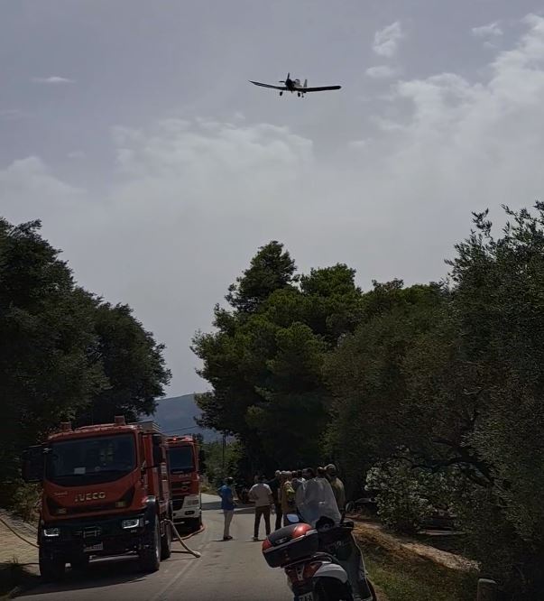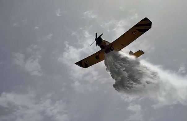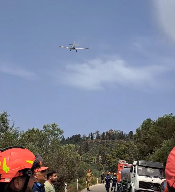 Η επιχείρηση ενισχύεται από δύο πυροσβεστικά αεροσκάφη που πραγματοποιούν συνεχείς ρίψεις νερού, συμβάλλοντας σημαντικά στις προσπάθειες των επίγειων δυνάμεων.