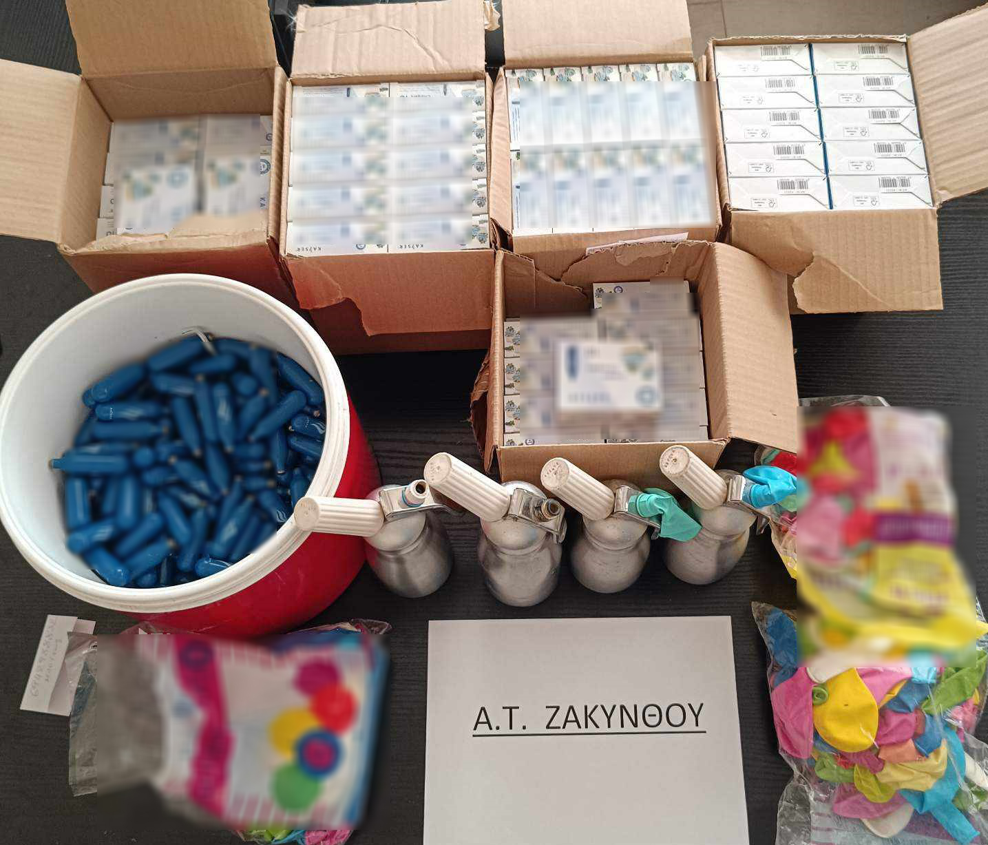 Αποτέλεσμα των ελέγχων που πραγματοποιήθηκαν τις πρώτες πρωινές ώρες του Σαββάτου [20.07.2024], από αστυνομικούς Υπηρεσιών της Διεύθυνσης Αστυνομίας Ζακύνθου σε δύο καταστήματα υγειονομικού ενδιαφέροντος στην περιοχή του Λαγανά, ήταν κατασχεθεί μεγάλος αριθμός αμπουλών αερίου γέλιου, μπαλόνια και μηχανισμοί χρήσης.