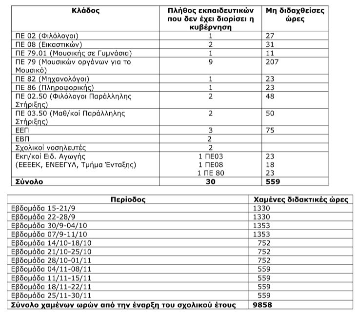 «Το ΥΠΑΙΘΑ εξακολουθεί να αφήνει τους μαθητές χωρίς εκπαιδευτικούς-9.858 χαμένες ώρες μέχρι το τέλος Νοεμβρίου»