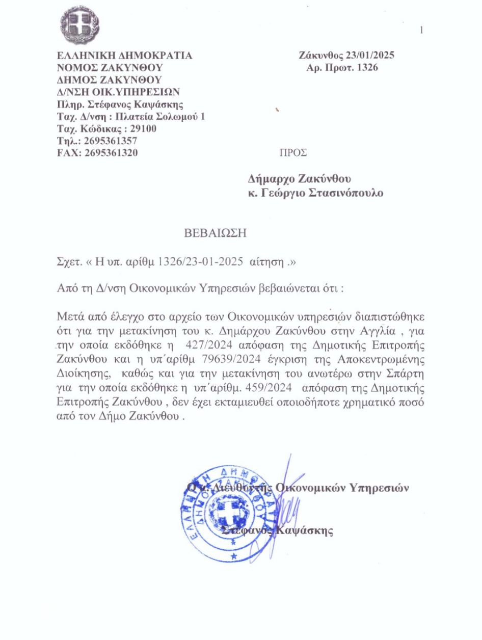 Σε συνέχεια της χθεσινής μου ανακοίνωσης και δέσμευσης, δημοσιεύω σήμερα την βεβαίωση της Οικονομικής Υπηρεσίας του Δήμου με την οποία βεβαιώνεται ότι δεν έχω λάβει κανένα χρηματικό ποσό από το Δήμο για τα συγκεκριμένα ταξίδια.