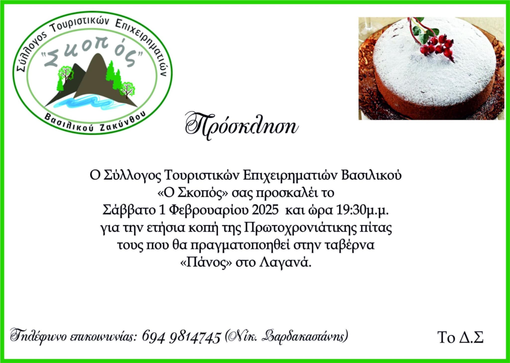 Την καθιερωμένη κοπή της Πρωτοχρονιάτικης πίτας για τη νέα χρονιά διοργανώνει ο Σύλλογος Τουριστικών Επιχειρηματιών Βασιλικού Ζακύνθου «Ο ΣΚΟΠΟΣ».