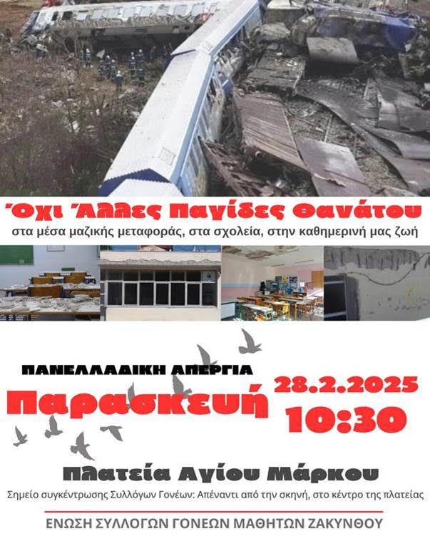 - «Εμείς οι γονείς 28 Φλεβάρη ΑΠΕΡΓΟΥΜΕ και συμμετέχουμε στην ΑΠΕΡΓΙΑΚΗ ΣΥΓΚΕΝΤΡΩΣΗ που καλούν τα σωματεία της Ζακύνθου στις 10:30 στην Πλατεία Αγίου Μάρκου»