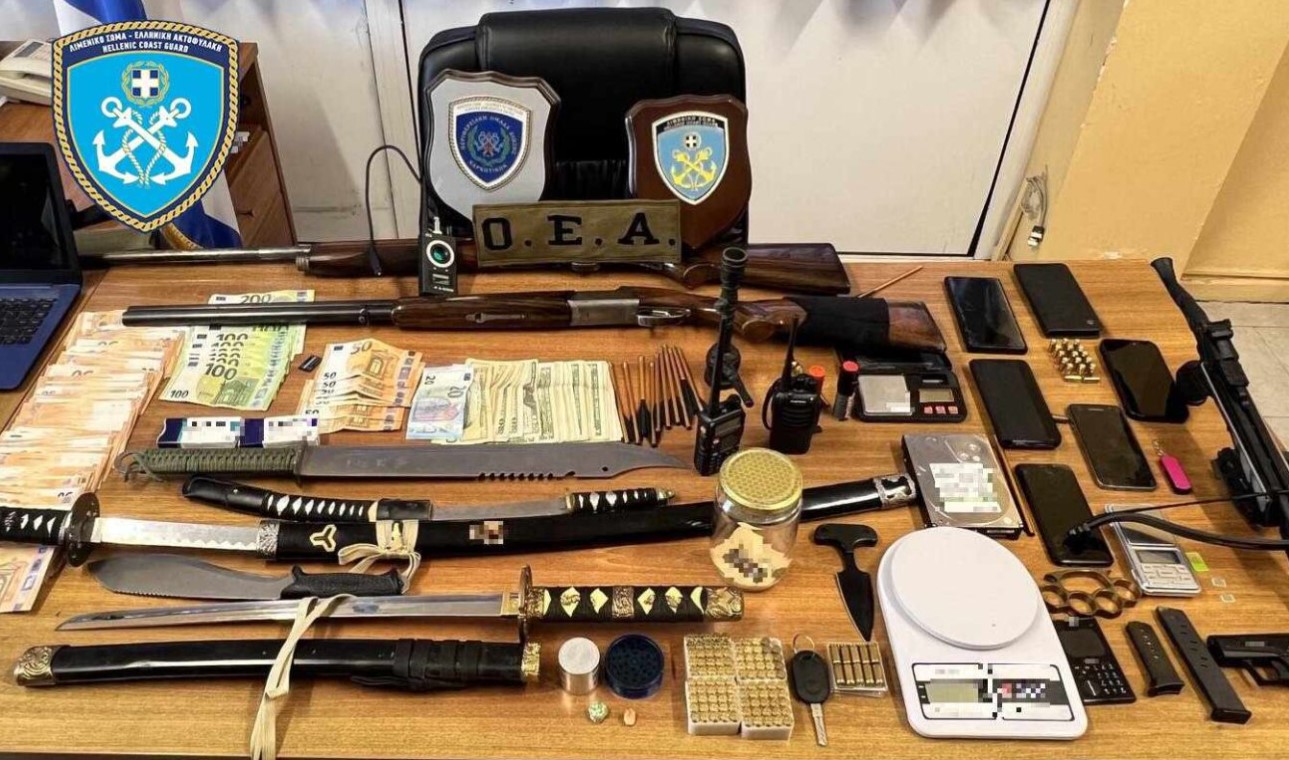 Σε έρευνες του Λιμενικού στις οικίες τους σε Λαμπέτι και Ανθόπυργο εντοπίστηκε και κατασχέθηκε ολόκληρο οπλοστάσιο με διάφορα όπλα και σπαθιά, κοκαΐνη καθώς και 6.000 ευρώ