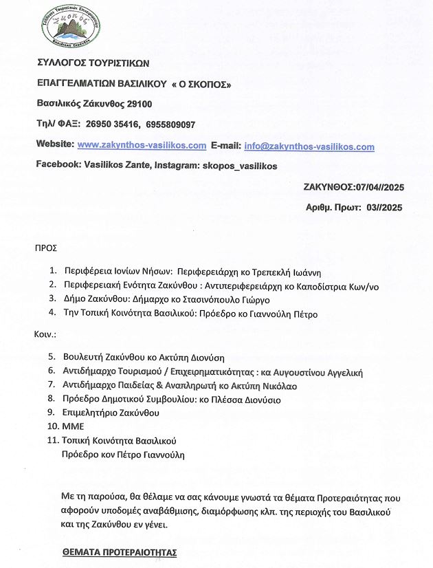 Επιστολή στις Τοπικές Αρχές για το μέλλον της περιοχής του Βασιλικού και της Ζακύνθου από τον ΣΥΛΛΟΓΟ ΤΟΥΡΙΣΤΙΚΩΝ ΕΠΑΓΓΕΛΜΑΤΙΩΝ ΒΑΣΙΛΙΚΟΥ «Ο ΣΚΟΠΟΣ»-Τα θέματα Προτεραιότητας