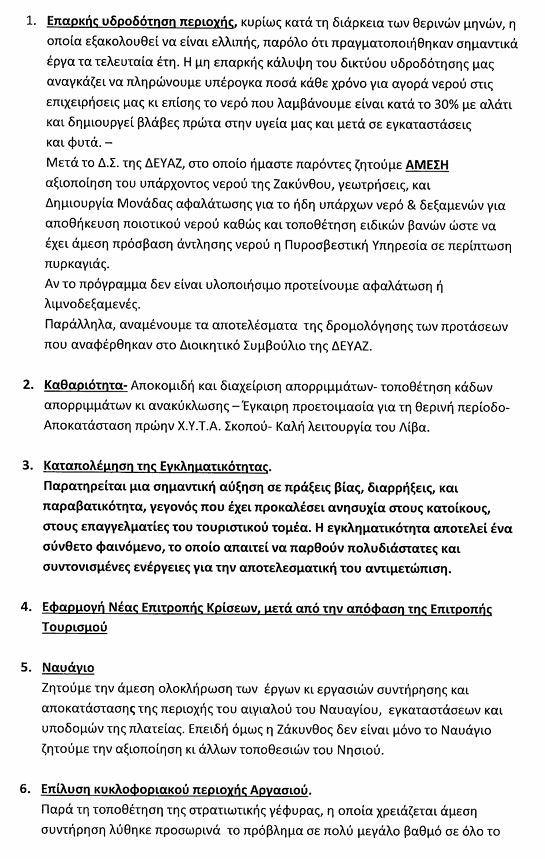 1. Επαρκής υδροδότηση περιοχής, κυρίως κατά τη διάρκεια των θερινών μηνών, η οποία εξακολουθεί να είναι ελλιπής, παρόλο ότι πραγματοποιήθηκαν σημαντικά έργα τα τελευταία έτη. Η μη επαρκής κάλυψη του δικτύου υδροδότησης μας αναγκάζει να πληρώνουμε υπέρογκα ποσά κάθε χρόνο για αγορά νερού στις επιχειρήσεις μας κι επίσης το νερό που λαμβάνουμε είναι κατά το 30% με αλάτι και δημιουργεί βλάβες πρώτα στην υγεία μας και μετά σε εγκαταστάσεις και φυτά.