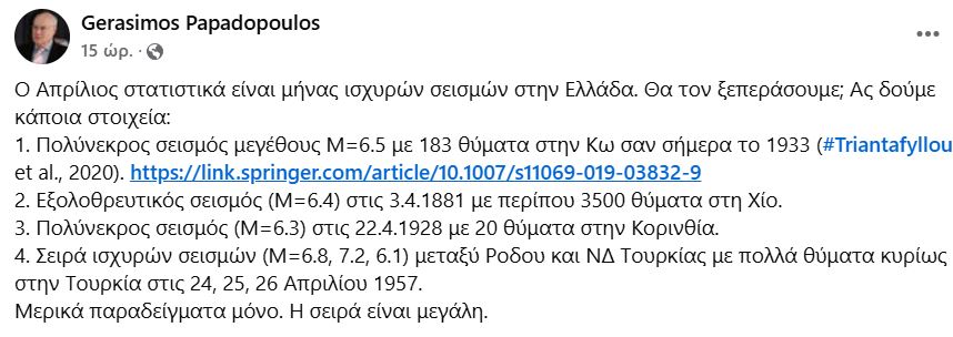 «Ο Απρίλιος στατιστικά είναι μήνας ισχυρών σεισμών στην Ελλάδα. Θα τον ξεπεράσουμε; Ας δούμε κάποια στοιχεία… Μερικά παραδείγματα μόνο. Η σειρά είναι μεγάλη», αναφέρει στη σχετική ανάρτηση ο κ. Παπαδόπουλος παραθέτοντας τα παραδείγματα: