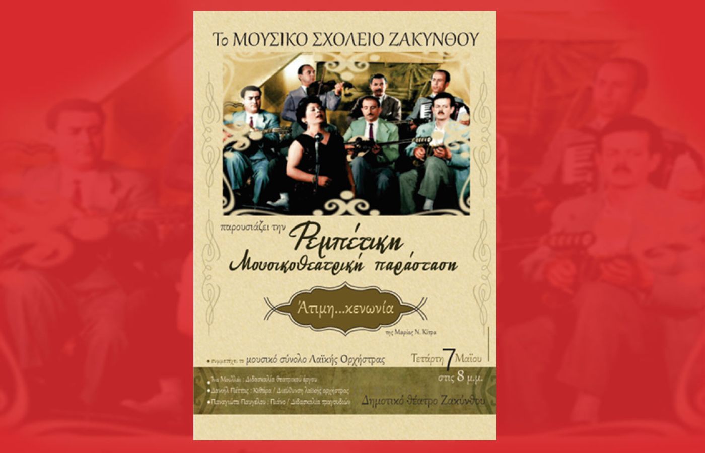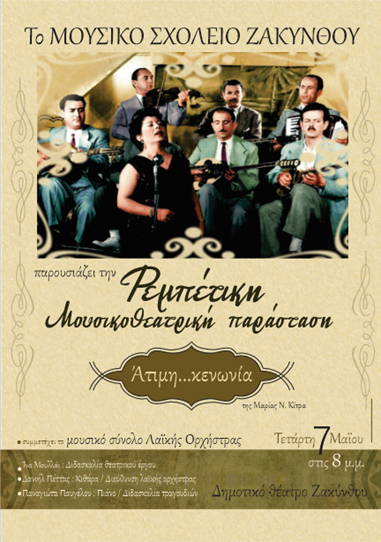 ΤΟ ΜΟΥΣΙΚΟ ΣΧΟΛΕΙΟ ΖΑΚΥΝΘΟΥ ΣΑΣ ΠΡΟΣΚΑΛΕΙ ΣΤΗΝ ΡΕΜΠΕΤΙΚΗ ΜΟΥΣΙΚΟΘΕΑΤΡΙΚΗ ΠΑΡΑΣΤΑΣΗ ΠΟΥ ΠΑΡΟΥΣΙΑΖΕΙ ΣΤΟ ΔΗΜΟΤΙΚΟ ΘΕΑΤΡΟ ΖΑΚΥΝΘΟΥ ΤΗΝ ΤΕΤΑΡΤΗ 8/5/2025 ΚΑΙ ΩΡΑ 8.00 μ.μ