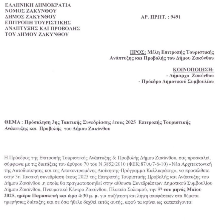 Συνεδριάζει η Επιτροπή Τουρισμού του Δήμου Ζακύνθου