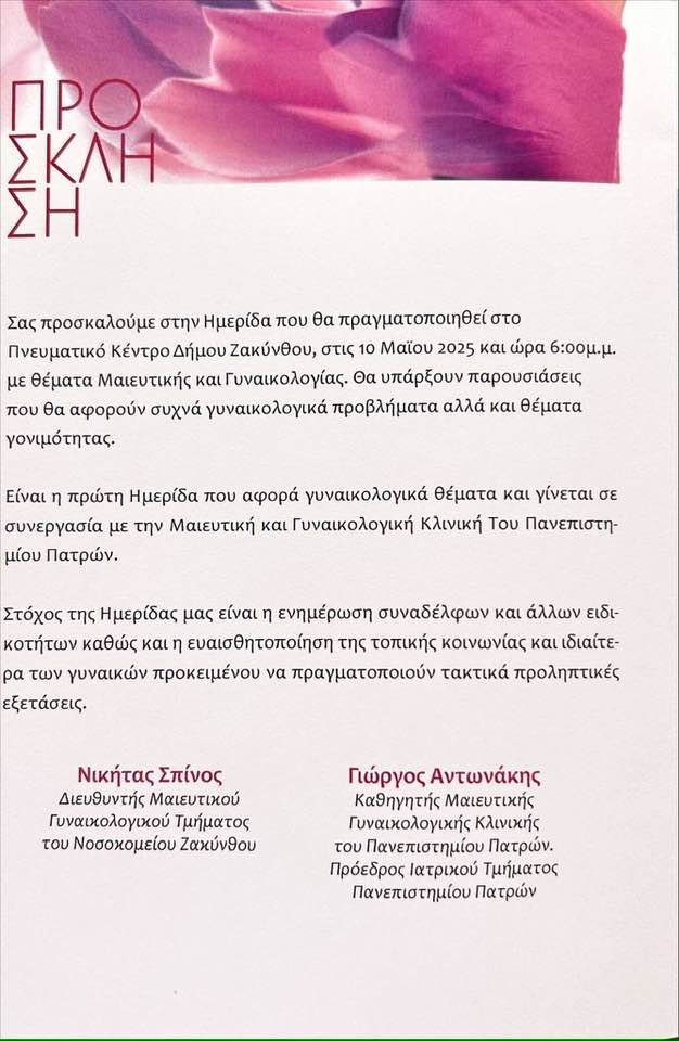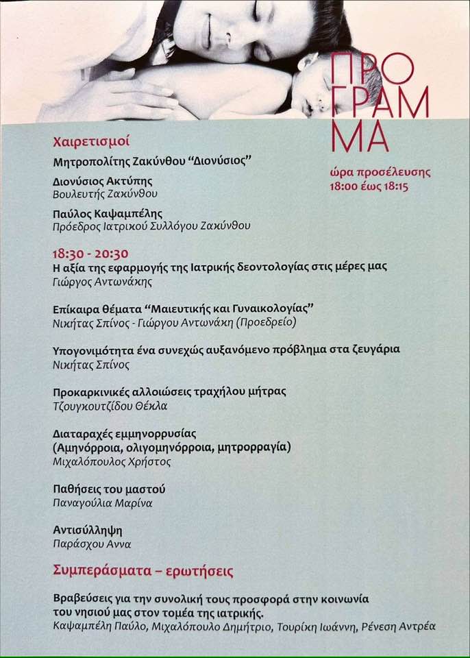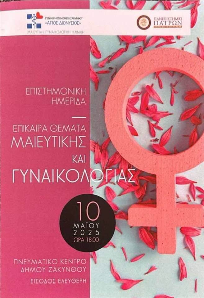 Ο Διευθυντής του Μαιευτικού / Γυναικολογικού Τμήματος του Γενικού Νοσοκομείου Ζακύνθου, Δρ. Νικήτας Σπίνος, ενημερώνει για την πραγματοποίηση Επιστημονικής Ημερίδας που συνδιοργανώνεται με την αντίστοιχη κλινική του Πανεπιστημίου Πατρών για πρώτη φορά στη Ζάκυνθο, το Σάββατο 10 Μαΐου και ώρα 18:00 στο πνευματικό κέντρο Ζακύνθου, κατά την διάρκεια της οποίας θα παρουσιαστούν επίκαιρα θέματα στην μαιευτική και γυναικολογία.