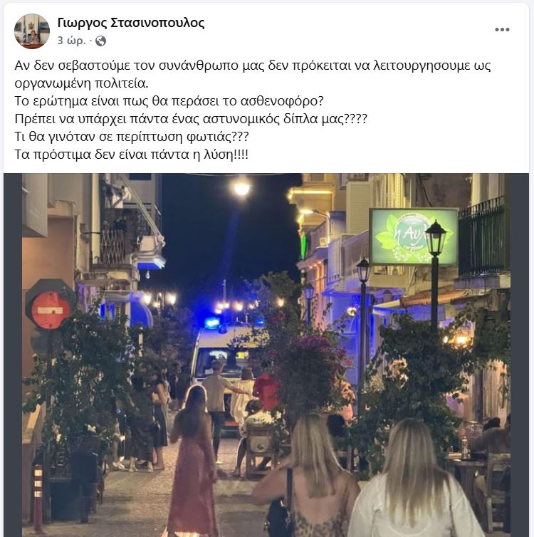 Την ανάρτηση συνοδεύει φωτογραφία όπου φαίνεται αδύνατη η διέλευση ασθενοφόρου σε πεζόδρομο.