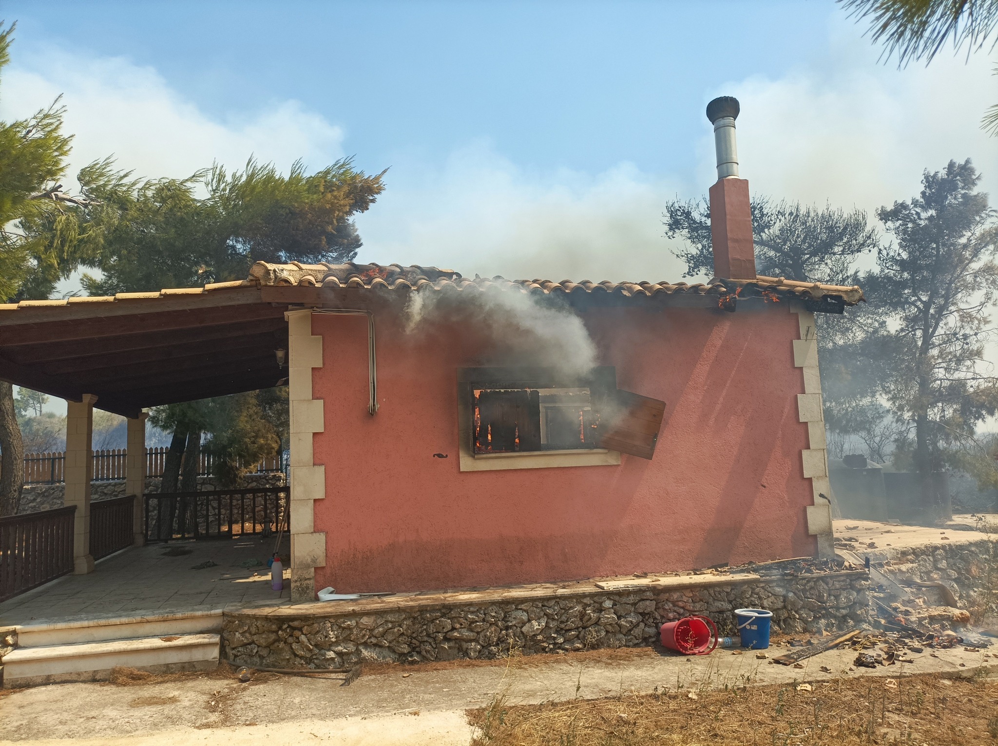 Η φωτιά καίει ανεξέλεγκτα και σε Λιθακιά, Αγαλά. Ζημιές σε σπίτια υπήρξαν στην Αγαλά, καθώς η πυρκαγιά πέρασε μέσα από το χωριό.