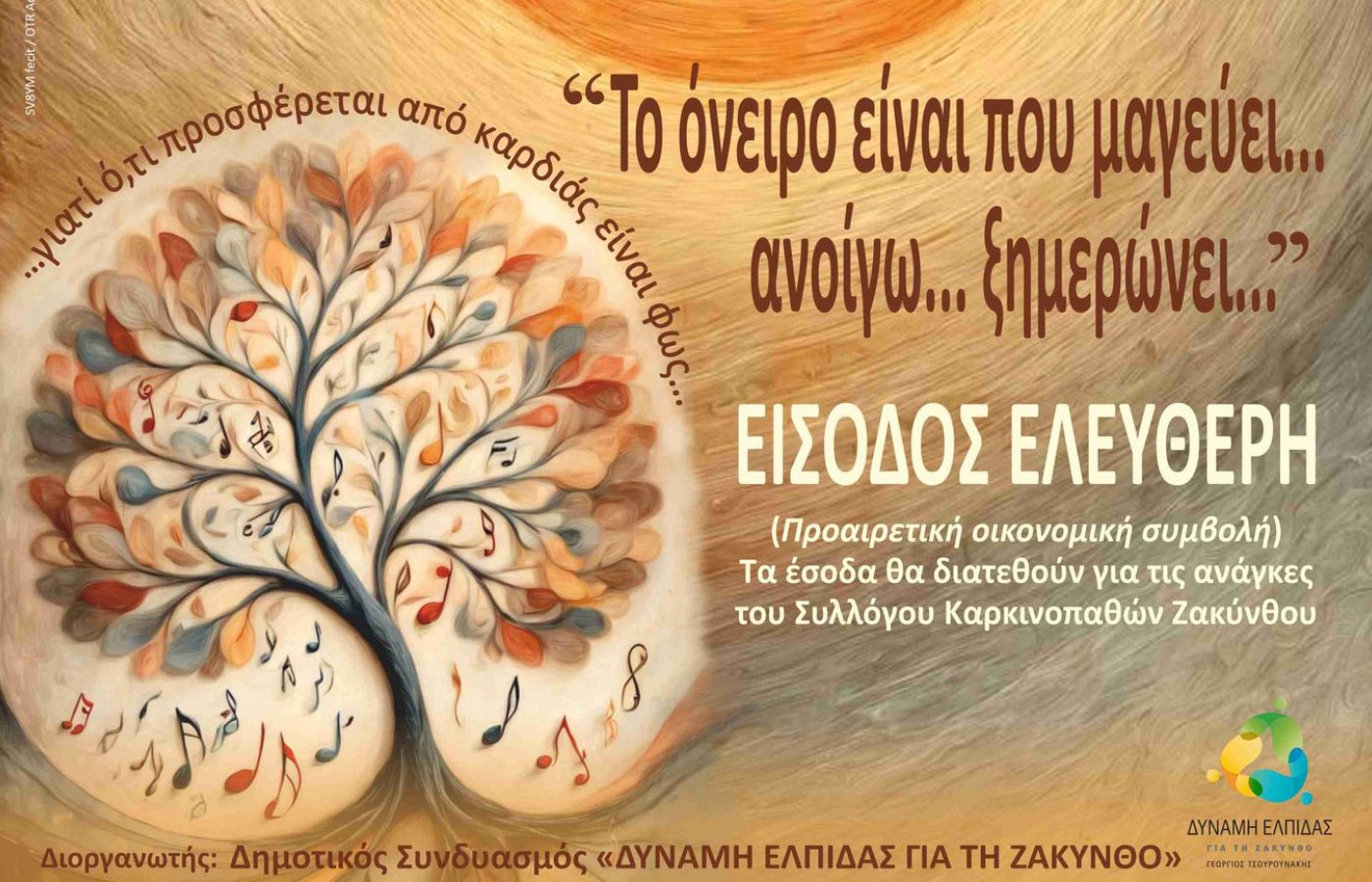 Με πρωτοβουλία του δημοτικού συνδυασμού «Δύναμη Ελπίδας για τη Ζάκυνθο - Γ. Τσουρουνάκης» και με σκοπό την ενίσχυση του Συλλόγου Καρκινοπαθών του νησιού, γνωστοί καλλιτέχνες θα χαρίσουν ανιδιοτελώς νότες ελπίδας στους ανθρώπους που δοκιμάζονται, σε μια συναυλία στο Υπαίθριο Θέατρο Ζακύνθου την Κυριακή 14 Σεπτεμβρίου στις 8 μ.μ.με ελεύθερη είσοδο