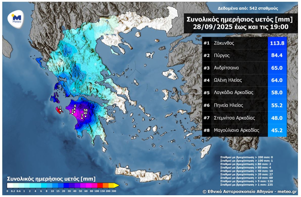 Σύμφωνα με δίκτυο αυτόματων μετεωρολογικών σταθμών του Εθνικού Αστεροσκοπείου Αθηνών / Meteo.gr μεγάλα ύψη βροχής καταγράφηκαν στη Δυτική Πελοπόννησο και στα νησιά του Ιονίου, όπως αποτυπώνεται στη χρωματική κλίμακα του χάρτη, με το μεγαλύτερη ύψη βροχής, μέχρι και τις 19:00, να καταγράφονται στη Ζάκυνθο με 113.8 mm.