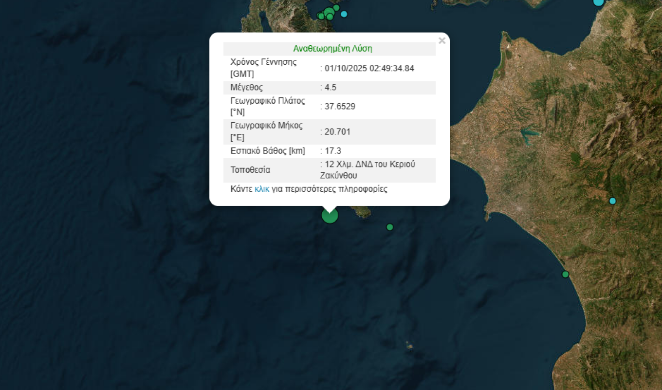 Σεισμός μεγέθους 4,5 βαθμών της κλίμακας Ρίχτερ σημειώθηκε στις 05:49 τα ξημερώματα της Τετάρτης στα ανοιχτά της Ζακύνθου.