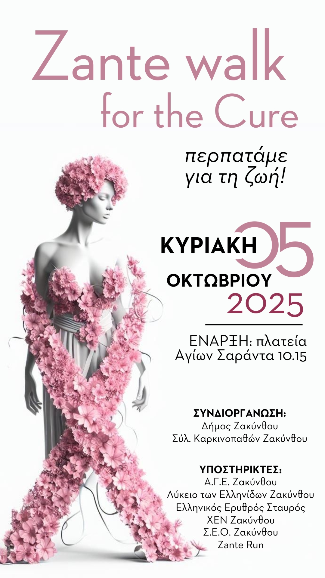 Ο Δήμος Ζακύνθου υποστηρίζοντας τον αγώνα των καρκινοπαθών, σε συνεργασία με τον Σύλλογο Καρκινοπαθών Ζακύνθου, συνδιοργανώνει τον συμβολικό περίπατο “Zante Walk for the Cure”, μια κοινωνική δράση που έχει ως στόχο την ευαισθητοποίηση της τοπικής κοινωνίας για τη σημασία της ενημέρωσης, της πρόληψης και της έγκαιρης διάγνωσης του καρκίνου του μαστού.