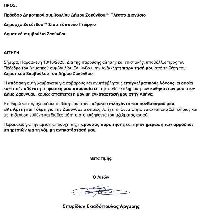 Εγώ, Ο Σπυρίδων Σκιαδόπουλος - Αργύρης, Δημοτικός Σύμβουλος στον Δήμο Ζακύνθου εκλεγμένος με την παράταξη «Αρετή και Τόλμη για τη Ζάκυνθο», ανακοινώνω την παραίτησή μου από το αξίωμα αυτό του δημοτικού συμβούλου.