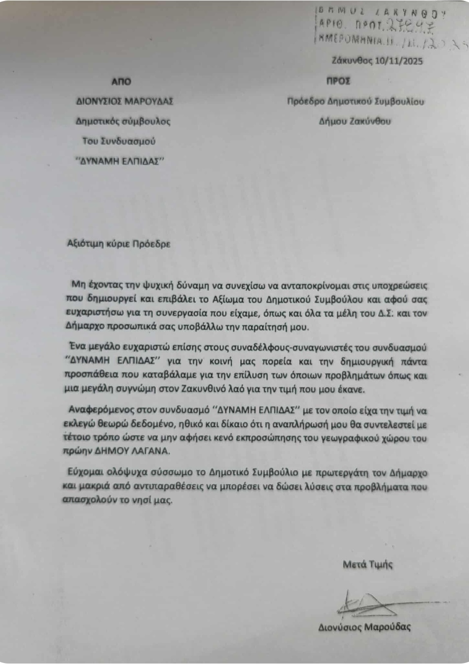 «Μη έχοντας την ψυχική δύναμη να συνεχίσω να ανταποκρίνεται στις υποχρεώσεις που δημιουργεί και επιβάλλει το αξίωμα του Δημοτικού Συμβούλου και αφού σας ευχαριστήσω για τη συνεργασία που είχαμε , όπως και όλα τα μελή του Δ.Σ και τον Δήμαρχο προσωπικά σας υποβάλω την παραίτηση μου» αναφέρει χαρακτηριστικά στην επιστολή παραίτησής του από τη θέση του δημοτικού συμβούλου του Δήμου Ζακύνθου ο Δημοτικός Σύμβουλος [ΔΥΝΑΜΗ ΕΛΠΙΔΑΣ] κ. Διονύσης Μαρούδας, ενώ προσθέτει «Θεωρώ δεδομένο, ηθικό και δίκαιο ότι η αναπλήρωση μου θα συντελεστεί με τέτοιο τρόπο ώστε να μην αφήσει κενό εκπροσώπησης του γεωγραφικού χώρου του πρώην ΔΗΜΟΥ ΛΑΓΑΝΑ»